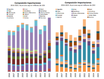 El análisis en el plano internacional permite observar cómo las economías regionales se insertan en el comercio global y cuáles son los sectores que explican la generación y salida de divisas. La revisión del comercio exterior acumulado entre enero y septiembre de 2025 muestra una estructura fuertemente concentrada en algunos complejos primarios, donde unos pocos sectores explican la mayor parte de las exportaciones e importaciones.