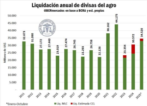 (NAP) Los diversos incentivos que impulsó el gobierno de Javier Milei durante el año (“dólar blend”, rebaja y eliminación temporaria de retenciones), posibilitaron que la agroindustria liquidara entre enero y octubre de este año US$ 34.500 millones, casi US$ 33.000 millones en el Mercado Libre de Cambios (según datos del BCRA y de CIARA-CEC) y un estimado de US$ 1.550 millones ingresados vía el dólar CCL. (contado con liqui).