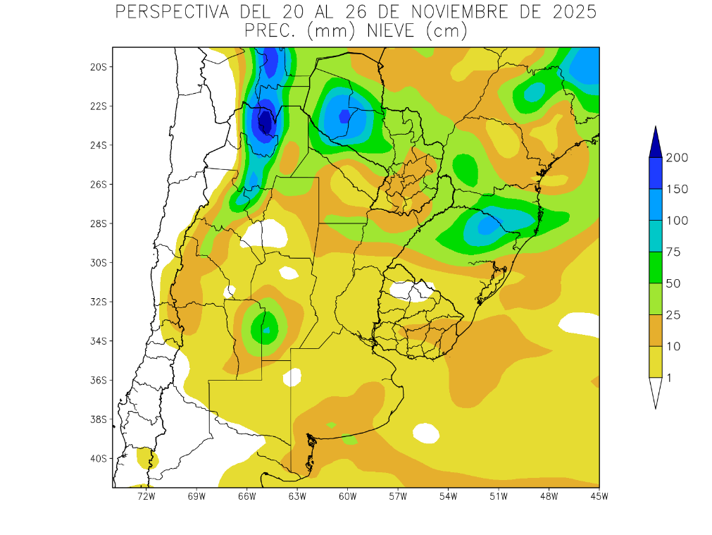 Hacia el final de la perspectiva, se producirá el paso de un frente de tormenta, causando lluvias moderadas a escasas en la mayor parte del área agrícola, salvo una franja de lluvias abundantes y tormentas, que correrá por el oeste y focos aislados de aportes abundantes sobre el extremo norte de la Mesopotamia, la desembocadura del Río de La Plata y otros puntos, a la vez que los vientos del sur, que acompañarán su paso, iniciarán un nuevo descenso térmico.