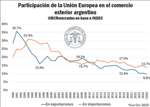 La misma tendencia se observa en las importaciones: el ingreso de productos europeos representó apenas 13,7% del total, la segunda marca más baja en 35 años. Con este escenario, la UE pierde protagonismo en el intercambio con la Argentina, mientras aumentan la gravitación de Asia -especialmente China- y los países del Sudeste Asiático.