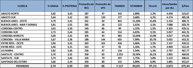 La radiografía por cuencas también refleja diferencias en la calidad de la leche, medida a través de sólidos útiles, donde las regiones con mayor desarrollo histórico y tecnológico muestran mejores promedios, mientras que las cuencas más periféricas presentan mayores dificultades para alcanzar esos estándares, lo que impacta directamente en el valor final del producto.