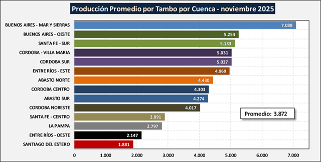Sin embargo, y tal como lo presenta el cuadro de apertura de la nota, la región más destacada en Producción Promedio por Tambo, en noviembre de 2025, fue la Cuenca Mar y Sierras, que comprende explotaciones de Tandil, Balcarce, Coronel Pringles, Rauch, y otros partidos del sudeste bonaerense.