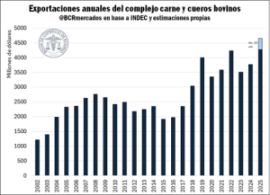 A pesar de la caída en volumen, por el alza de precios, el valor total de las exportaciones del complejo de carne y cueros bovinos alcanzaría el máximo valor en los registros.