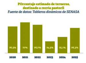 (NAP) La ganadería argentina mostró a lo largo de 2025, si se tiene en cuenta que de una población total de terneros y terneras de 14,6 millones de cabezas, al inicio del ciclo 10,7 millones, un 73%, fueron trasladados desde los campos de cría durante el año, aproximadamente 500 mil terneros más que en 2024, de acuerdo a los datos publicados por el Senasa, segín los DTe emitidos.