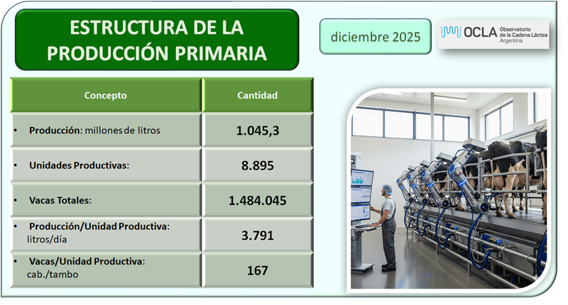 (NAP) El Observatorio de la Cadena Láctea Argentina publicó su informe de cierre de año sobre la Estructura de la Producción Primaria, con datos consolidados a diciembre de 2025 y números que reflejan una tendencia muy marcada hacia la consolidación de unidades productivas más grandes y eficientes.