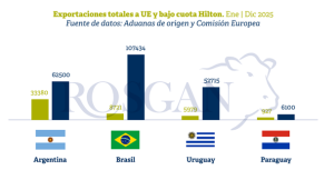 En el caso de Argentina, que goza de una posición claramente dominante dentro de la Cuota Hilton con 29.500 toneladas asignadas por ciclo comercial, el volumen exportado por fuera del contingente duplicó en 2025 al ingresado bajo cuota. Para el resto de los orígenes —especialmente Brasil— los excedentes resultan aún más significativos.