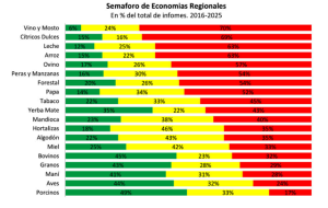 (NAP) Sólo cuatro actividades de las Economías Regionales finalizaron 2025 en verde, mientas que nueve quedaron en amarillo y seis en rojo, de acuerdo con los datos relevados por el Semáforo de Coninagro, que prepara el Departamento de Economía.