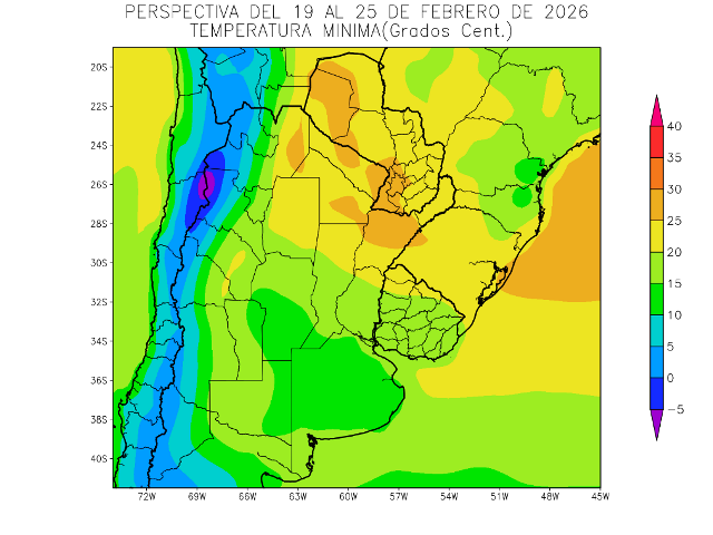 Mientras que Paraguay, el este del NOA, la Región del Chaco, el norte de la Región Pampeana, la mayor parte de la Mesopotamia, y el noroeste del Uruguay observarán temperaturas mínimas superiores a 20°C, con focos con valores superiores a 25°C, hacia el norte.