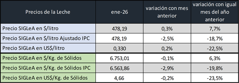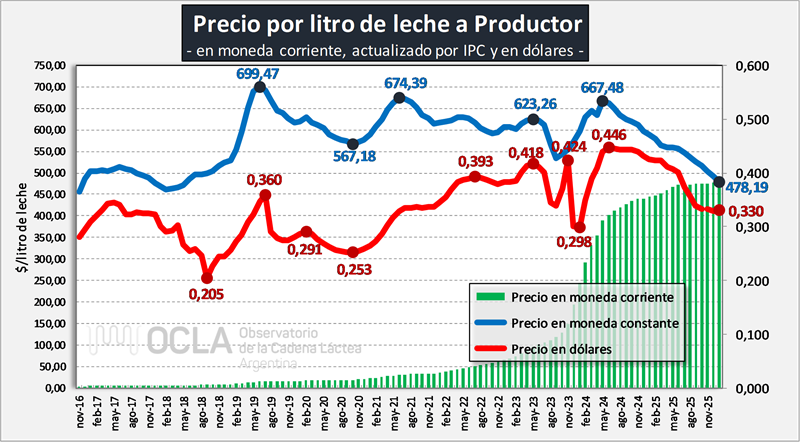 Así, el informe sobre precios pagodos a los productores por litro de leche, publicado por el Ocla en base solamente al Siglea, arrojó que, una vez ajustado por la inflación, el valor del litro en enero de 2026 es el más bajo de los últimos 8 años para ese mes.
