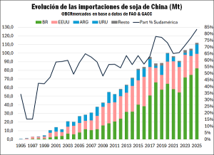 Durante el año 2025, China importó 112 Mt de soja, récord histórico. Con la particularidad de que nunca antes los porotos sudamericanos habían tenido tanta relevancia en el total. Desde el 2013 Brasil es el principal abastecedor de soja en el mercado asiático y el año anterior le exportó 82 Mt, cinco veces más que Estados Unidos. Desde Argentina se embarcaron casi 8 Mt y 3,1 Mt desde Uruguay, por lo que el 83% de las importaciones de soja en China durante el 2025 tuvo origen en Sudamérica.