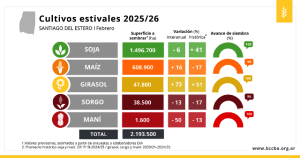 En soja se relevaron lotes mayormente en buen estado, con daños puntuales por anegamientos en sectores bajos luego de las lluvias intensas de fines de enero, concentrados principalmente en Los Juríes y Bandera. En paralelo, en Bandera, Sachayoj y Colonia Alpina se mencionó un déficit de precipitaciones leve que generó estrés hídrico en soja y maíz, al que se sumaron temperaturas elevadas con impacto térmico leve.