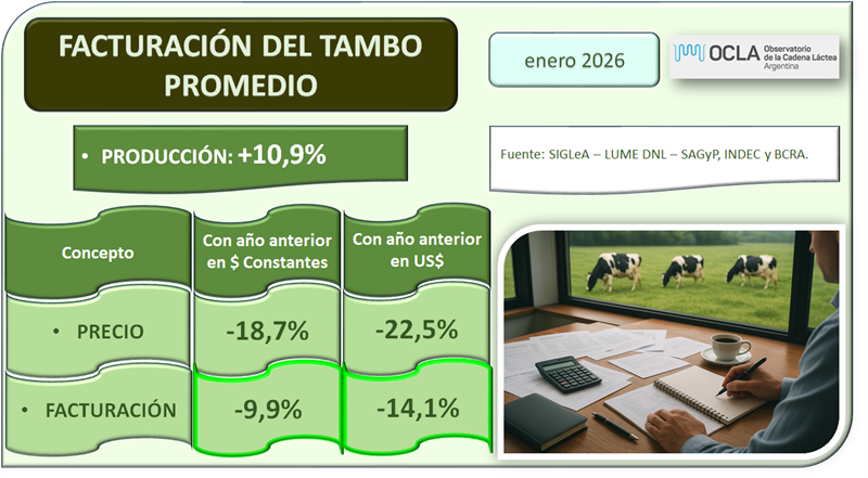 (NAP) El Observatorio de la Cadena Láctea Argentina publicó el análisis de la rentabilidad de los tambos en enero, basado en datos del Sistema Integrado de Gestión de la Lechería Argentina (SIGLeA) que ubican el precio promedio pagado al productor en torno a los $478,19 por litro.
