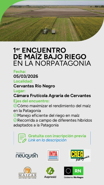 (NAP) El próximo 5 de marzo se realizará en Cervantes, Río Negro, el Primer Encuentro de Maíz bajo Riego en la Norpatagonia, una jornada técnica que busca consolidar el crecimiento del cultivo en los valles patagónicos y potenciar su integración con la ganadería, la industria y el desarrollo regional.