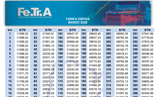 (NAP) El transporte de granos en Argentina volvió a encarecerse en marzo de 2026, en plena cosecha gruesa, tras la actualización de la tarifa de referencia definida por la Federación del Transporte de Argentina.