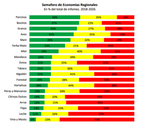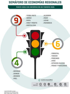 (NAP) El último semáforo de CONINAGRO, correspondiente a febrero de 2026, que mide la actividad de las economías regionales, otra vez encendió las luces de alarma, porque sobre un total de 19 actividades, nueve permanecen en rojo, seis en amarillo y solo cuatro se encuentran en verde.