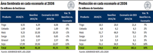 Según el estudio con la eliminación de DEX, se impulsa una expansión significativa: el área al alcanzar las 43,4 M ha en 2036 (2,2 M ha adicionales, un crecimiento del 5,4% respecto al escenario base) y la producción llega a 182,6 Mt (+16,7 Mt respecto al Baseline, un incremento del 10,1%). El mayor crecimiento absoluto corresponde al cultivo de soja, seguido por el maíz.
