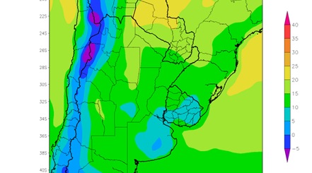 • El centro-este del NOA; el centro de Cuyo, el centro-este y el oeste de La Pampa, la mayor parte de Buenos Aires y el sur del Uruguay, registrarán temperaturas máximas entre 15 y 20°C.