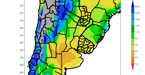 Se destacan dos áreas con valores inferiores a los normales (marrones), una es el NOA y la