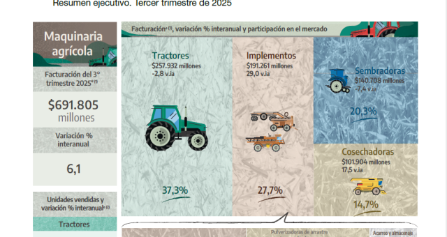 Sin embargo la venta de cosechadoras y sembradores mostraron bajas en el tercer trimestre del año. La comercialización de tractores mostró un mejor desempeño.