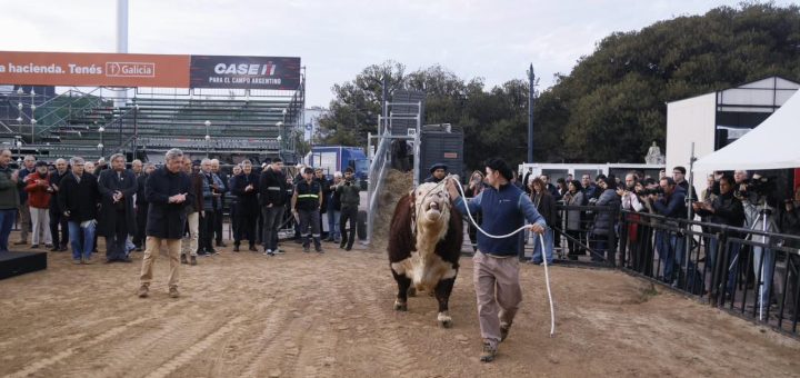 Desde Espartillar a Palermo, llegó un toro Hereford que abrió el ingreso de animales de la muestra ganadera más emblemática del país. Dirigentes a la espera de Milei.