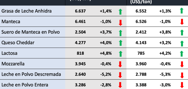 Cayó 2,3% en promedio y fue la leche en polvo descremada la que experimentó el mayor descenso. La leche en polvo entera cotizó a 3.286 dol/tn.