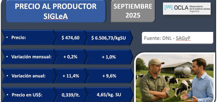 El Siglea relevó un precio promedio al productor de $474,60 por litro, 0,2% más que en agosto.