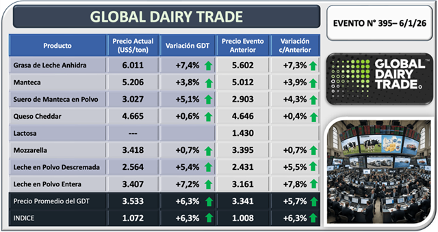 La leche en polvo entera superó los 3.400 dol/tn y empujó las subas. El 1er remate del año reforzó las expectativas de recuperación de los valores globales.