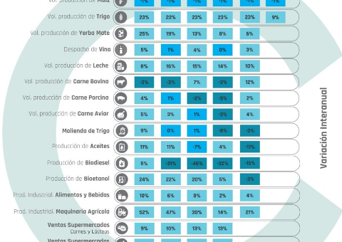 Sien embargo, cinco muestran caídas en los guarismos. Se registraron retrocesos en la producción de carne avícola, porcinos y aceites.